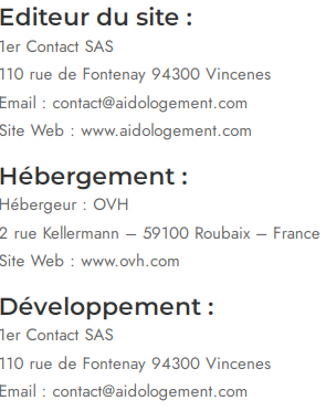 1er Contact SAS s’efforce de fournir sur le site www.aidologement.com des informations aussi précises que possible. Toutefois, il ne pourra être tenue responsable des omissions, des inexactitudes et des carences dans la mise à jour, qu’elles soient de son fait ou du fait des tiers partenaires qui lui fournissent ces informations.