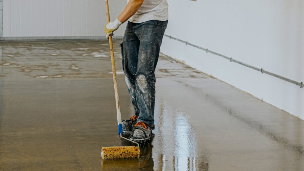 L’application méthodique de la résine époxy sur le sol